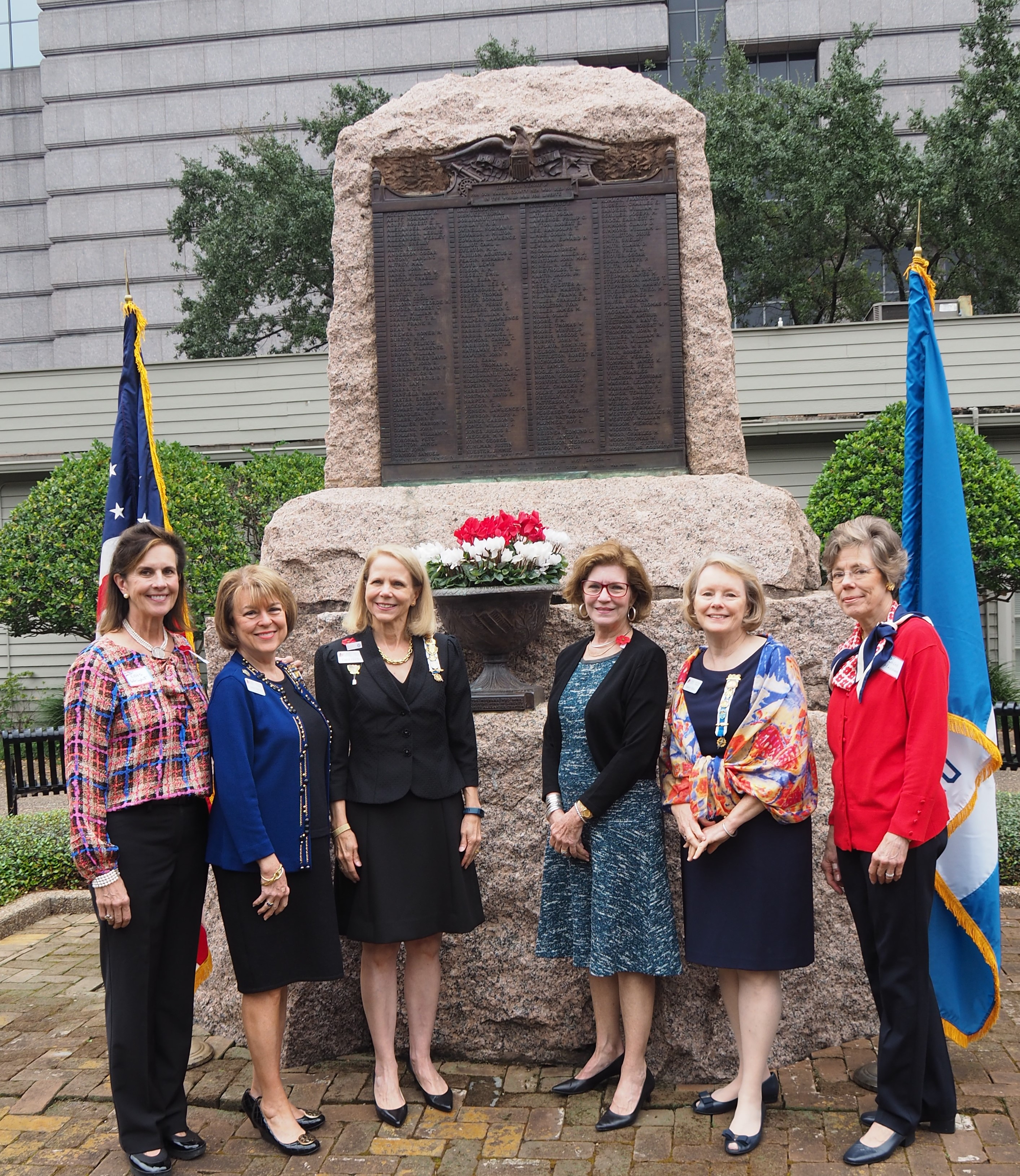 With the onset of the first world war, these DAR members enthusiastically participated in DAR efforts to sell War Bonds, rebuild a French village destroyed during the conflict, and “adopt” 28 French children whose fathers died in The Great War. The chapter also donated a beautifully designed bronze urn, placed at the Cenotaph memorial, then in front of old city hall and now located at John B. Connally Plaza in Sam Houston Park, in honor of the Gold Star Mothers. The chapter continues to hold a commemorative event at the cenotaph and urn annually on or around Veterans Day.